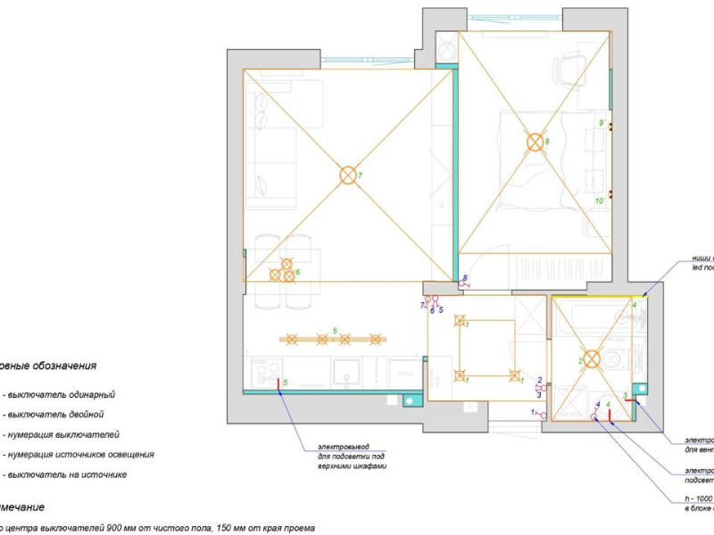 - Полный пакет чертежей для прораба: электрика (розетки, выключатели), освещение, раскладки полов, планы потолков и др.