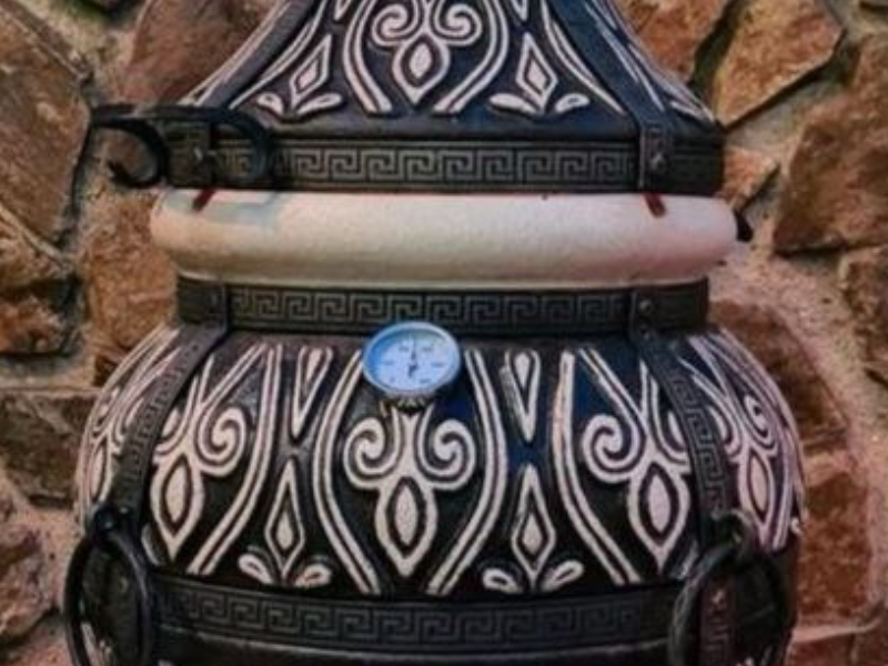 Тандыр на объем 85 литров, 144 кг, высота 102 см, толщина стенки 7 см. Комплектация 8 шт шампуров, кольцо-крестовина, совок, кочерга, крюк на мясо, нога-подставка кованная, механизм поддувала с ручкой, механизм крышки поворотный  и откидной 2в1.